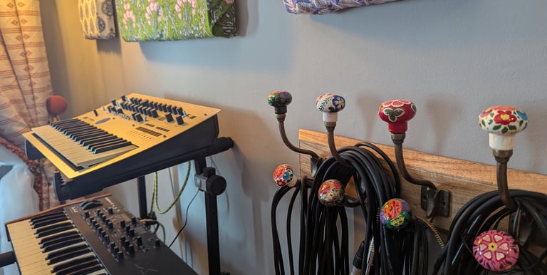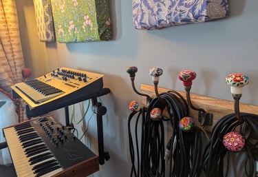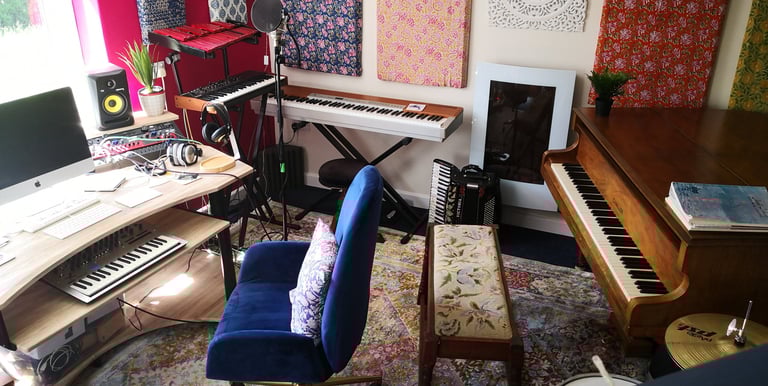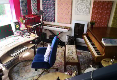 A magical spot, with handmade sound panels covered in Indian Kantha fabrics, rugs, trinkets and Ruby, my grand piano